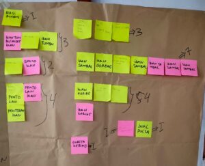 Peserta kemudian diajak untuk menuliskan ide-ide usaha yang mereka anggap paling mungkin dikembangkan di wilayah mereka. Berbagai gagasan muncul, mulai dari nasi bungkus, bakso ikan, kepiting saus tiram, pentol ikan, ikan kering, ikan goreng sambal, hingga usaha jual pulsa. Keragaman ide ini mencerminkan potensi besar yang dimiliki kelompok dalam mengolah sumber daya lokal menjadi peluang ekonomi.
